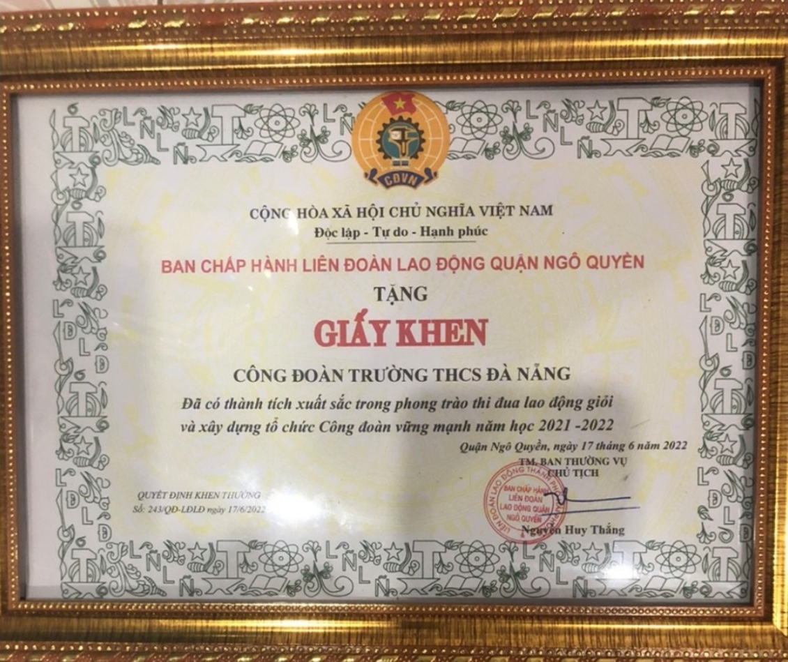 Tại Hội nghị, Công đoàn trường THCS Đà Nẵng vinh dự được tặng Giấy khen của LĐLĐ quận Ngô Quyền “Có thành tích xuất sắc trong thực hiện phong trào thi đua và xây dựng tổ chức Công đoàn vững mạnh”.