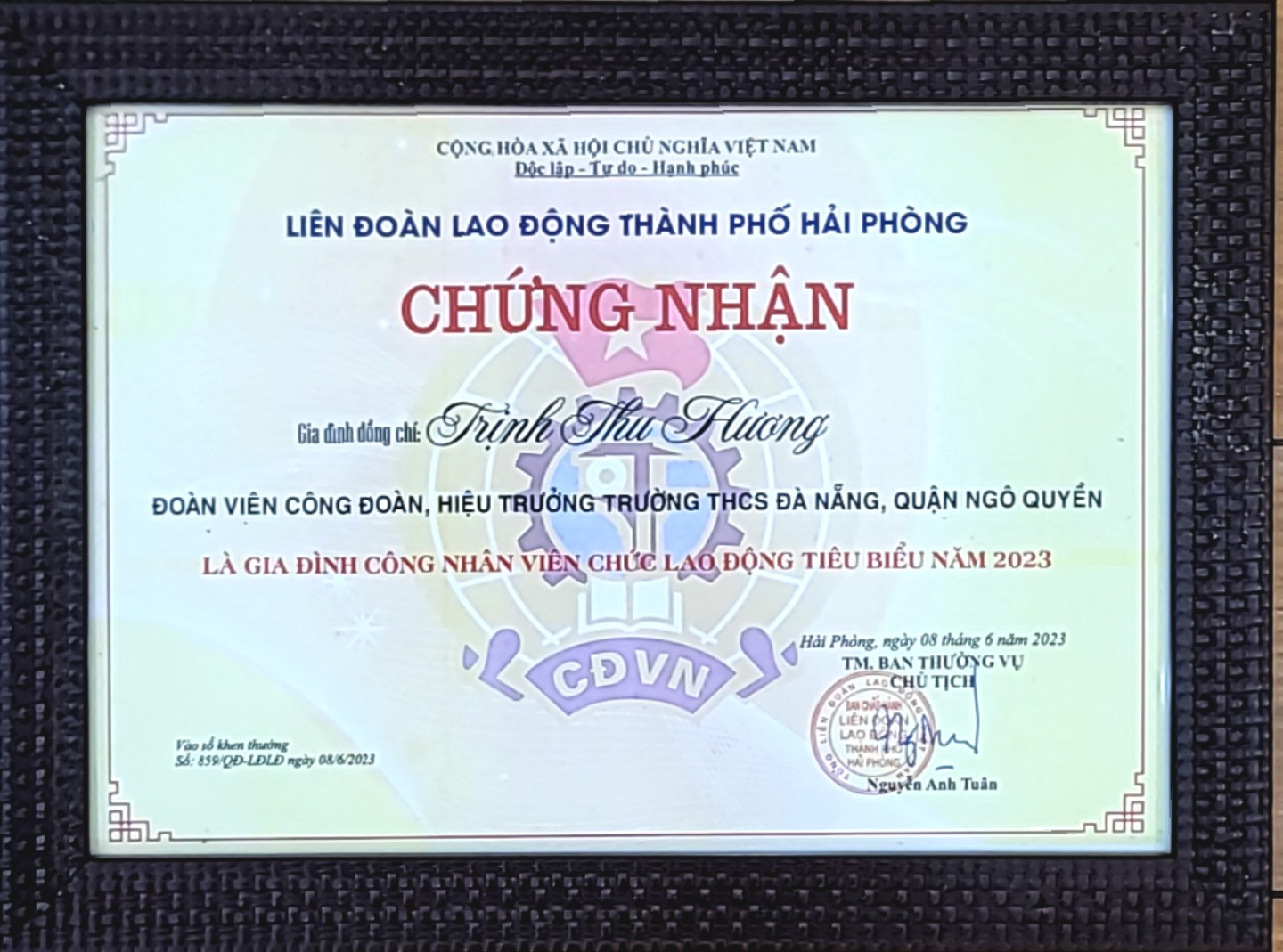 Với những thành công trong sự nghiệp trồng người, trong việc nuôi dạy con cái, trong việc giữ lửa của hạnh phúc gia đình, công đoàn viên Trịnh Thu Huơng hoàn toàn xứng đáng với chứng nhận Gia đình công nhân viên chức lao động tiêu biểu năm 2023 của Liên Đoàn Lao động Thành Phố Hải Phòng.