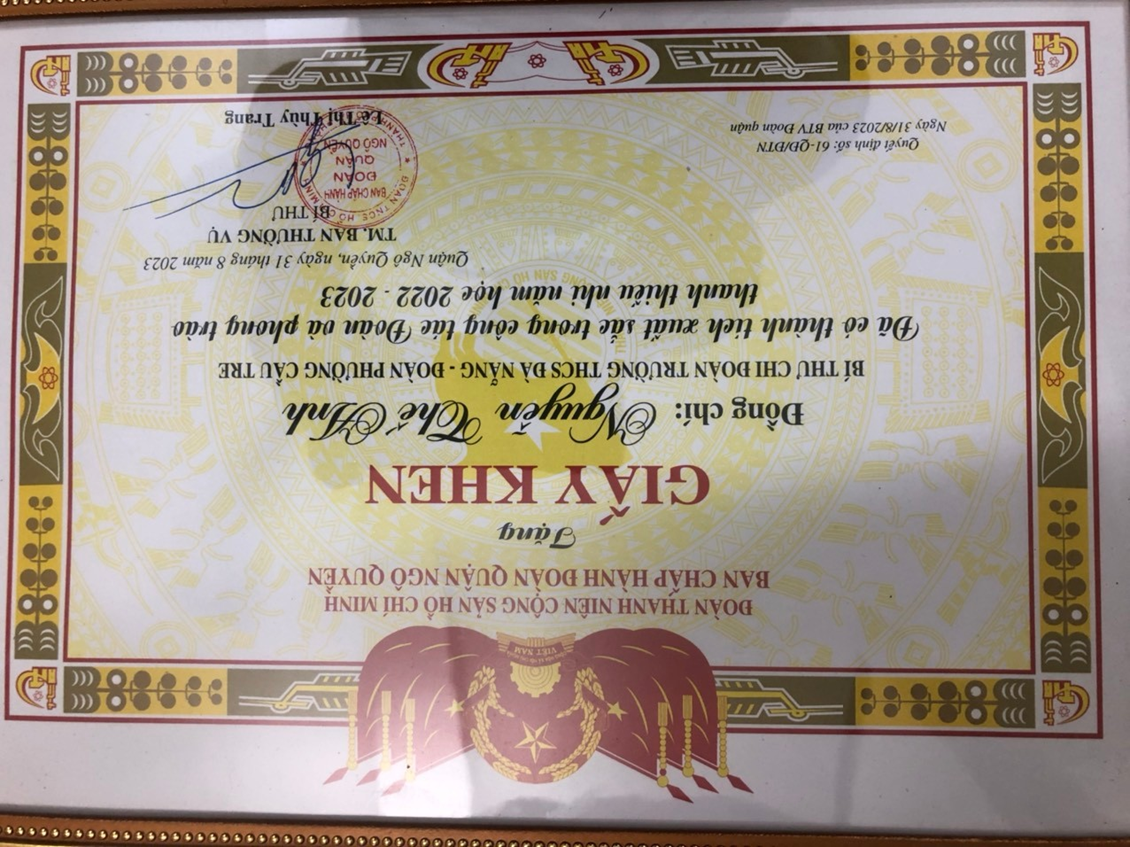 Thế Anh - Bí thư Chi đoàn giáo viên vinh dự được BCH Đoàn quận Ngô Quyền tặng Giấy