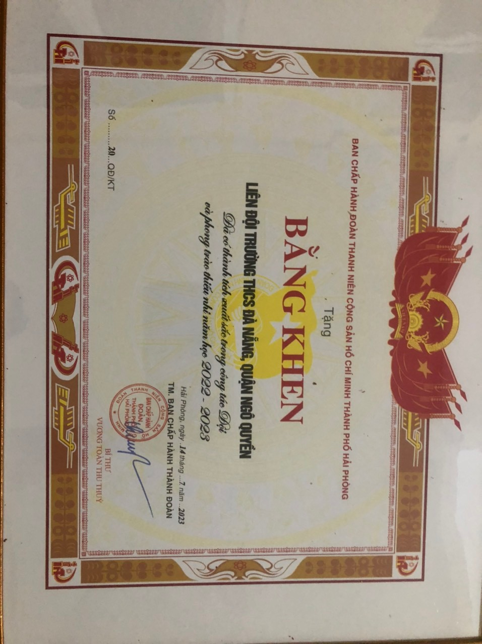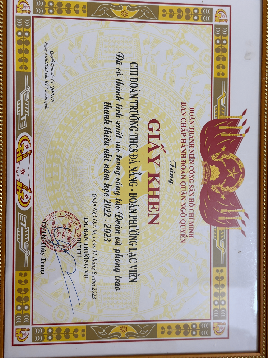 đoàn trường THCS Đà Nẵng vinh dự dược nhận Giấy khen của Ban chấp hành Đoàn quận