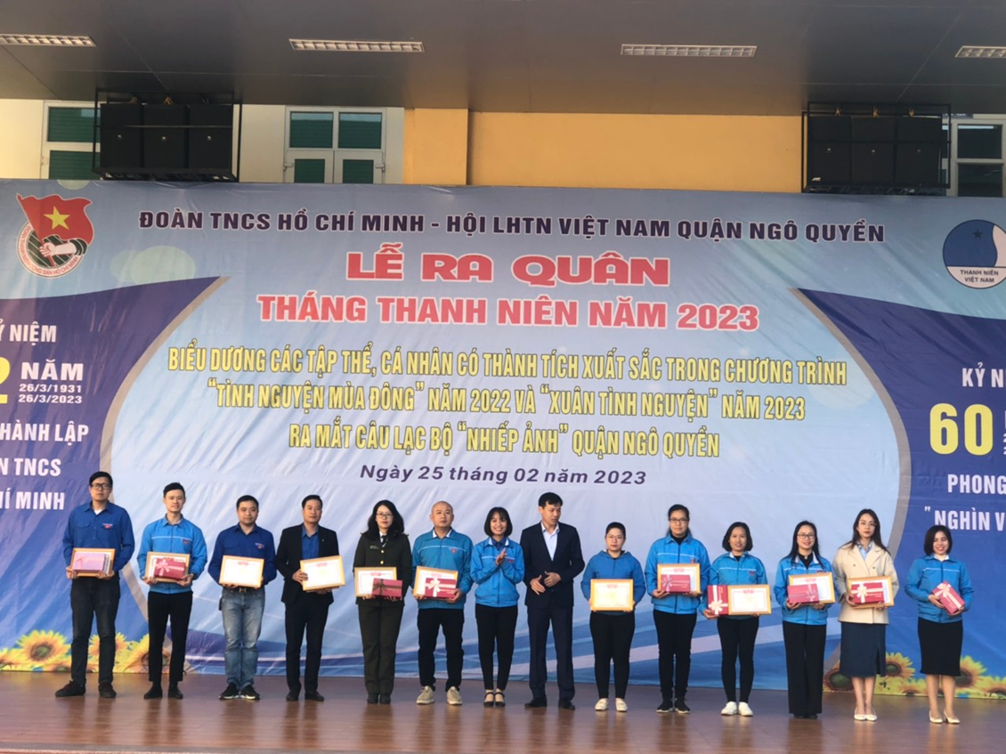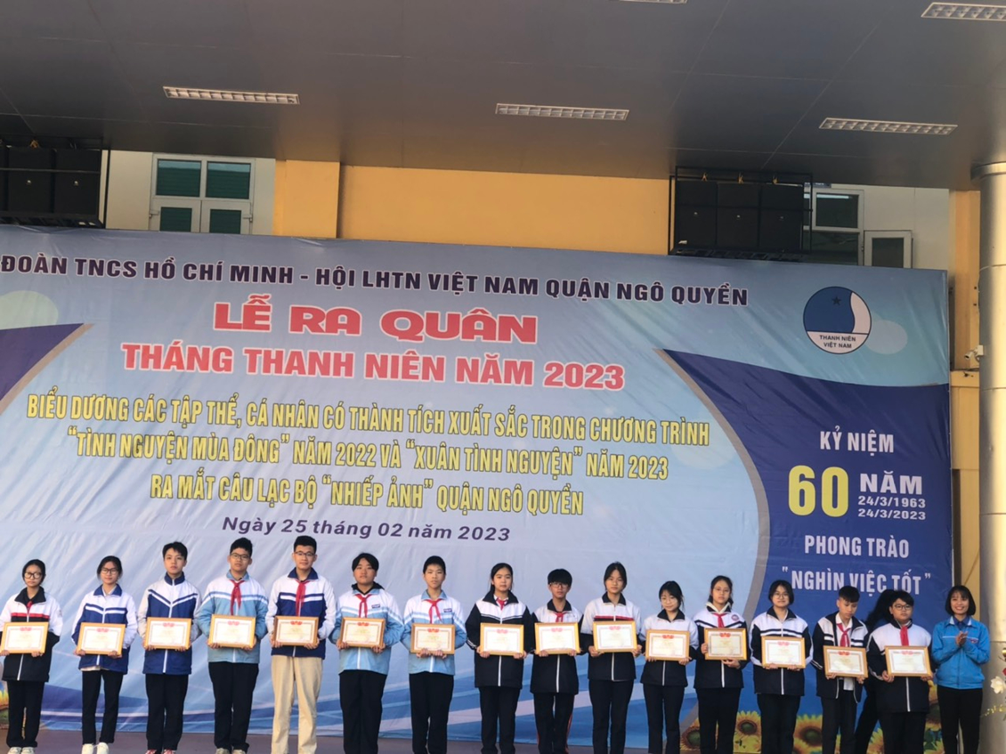 Tại buổi lễ, nhiều tập thể và cá nhân trường THCS Đà Nẵng được BCH Đoàn Quận Ngô Quyền khen thưởng vì đã có thành tích xuất sắc trong chương trình “Tình nguyện Mùa Đông” năm 2022 và “Xuân tình nguyện” năm 2023. Đó là tập thể: Liên đội THCS Đà Nẵng, lớp 6D10, lớp 6D11, lớp 7C1 cùng với 2 bạn đội viên tiêu biểu: Em Lê Hải An – lớp 9A2; Em Lê Tuệ Vy – lớp 6D11.