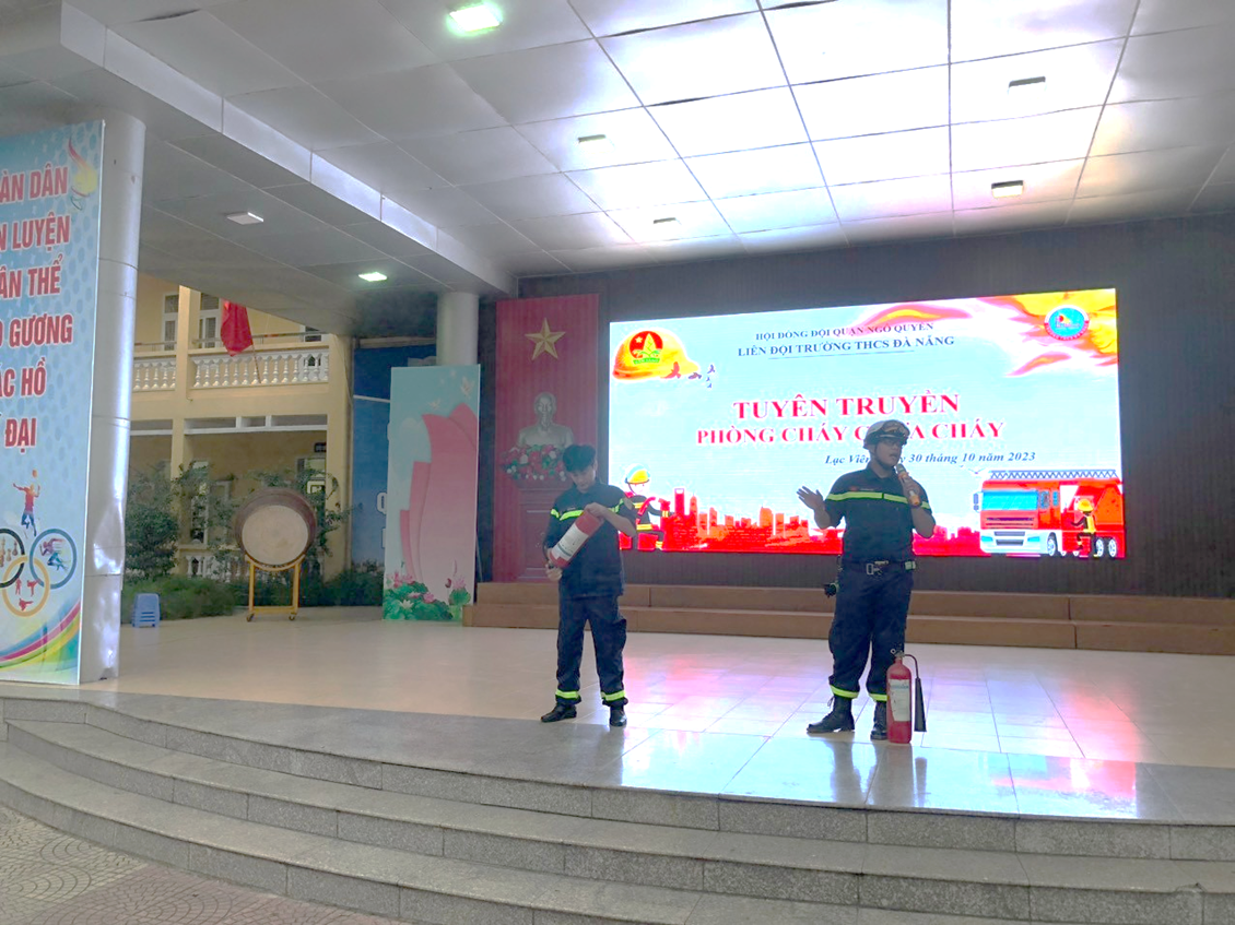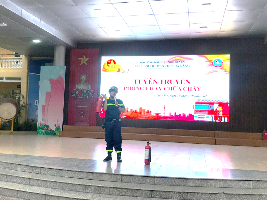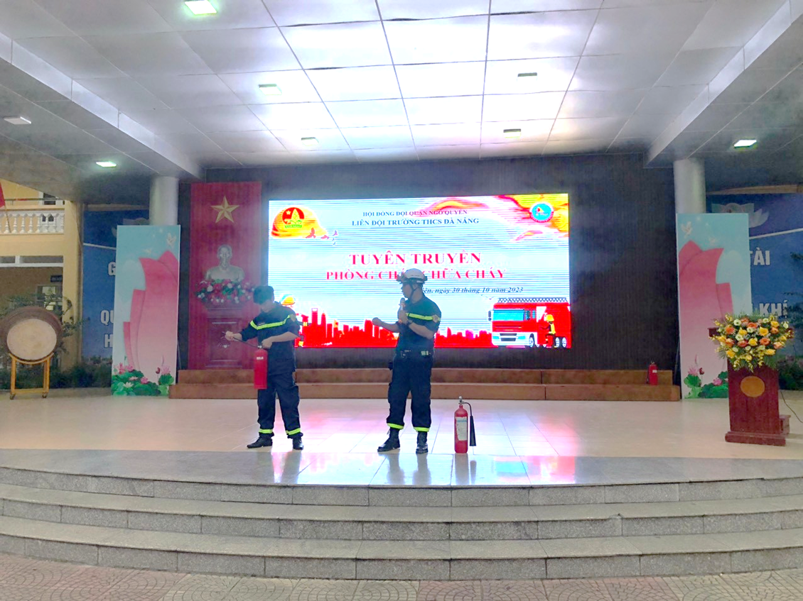Nhằm trang bị các kiến thức cơ bản về công tác phòng cháy chữa cháy; giúp đội viên nắm được các biện pháp, kỹ năng phòng cháy và chữa cháy, đồng thời sử dụng thành thạo các dụng cụ, phương tiện chữa cháy ban đầu. Vừa qua, Liên đội trường THCS Đà Nẵng tổ chức buổi “ Tuyên truyền về công tác Phòng cháy, chữa cháy và cứu hộ cứu nạn”. Về dự chương trình có Thượng úy Lê Quảng Đạt và các đồng chí cảnh sát trong đội PCCC&CNCH công an quận Ngô Quyền.