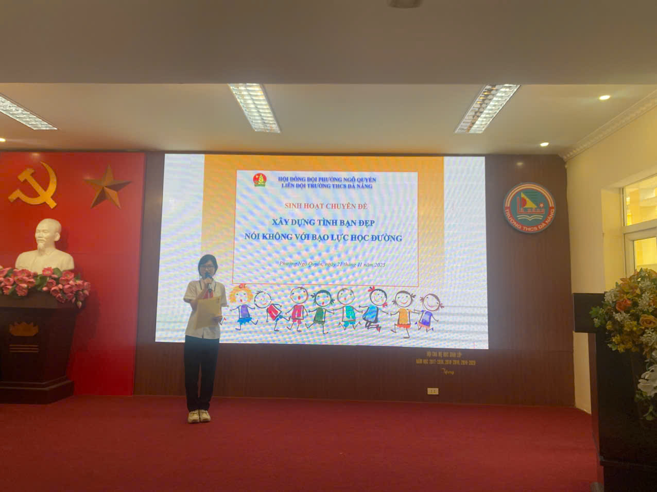 🔥Chính vì vậy để góp phần đẩy lùi vấn nạn này Liên đội THCS Đà Nẵng đã tổ chức sinh hoạt chi Đội “Xây dựng tình bạn đẹp nói không với bạo lực học đường” vào ngày 21/11/2025 với sự tham gia của cô giáo Nguyễn Thị Như Trang – Phó bí thư chi bộ – phó hiệu trưởng nhà trường , cùng các thầy cô giáo trong chi đoàn giáo viên cùng hơn 100 bạn học sinh đại diện các lớp. Hoạt động không chỉ giáo dục kiến thức pháp luật mà còn nâng cao kĩ năng sống giúp các bạn biết bảo vệ mình cũng như các biện pháp giải quyết khi gặp các vấn đề có liên quan nạn bạo lực học đường.