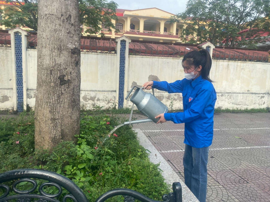 Đoàn viên Giáo viên chăm sóc cây khu vực khuôn viên nhà trường