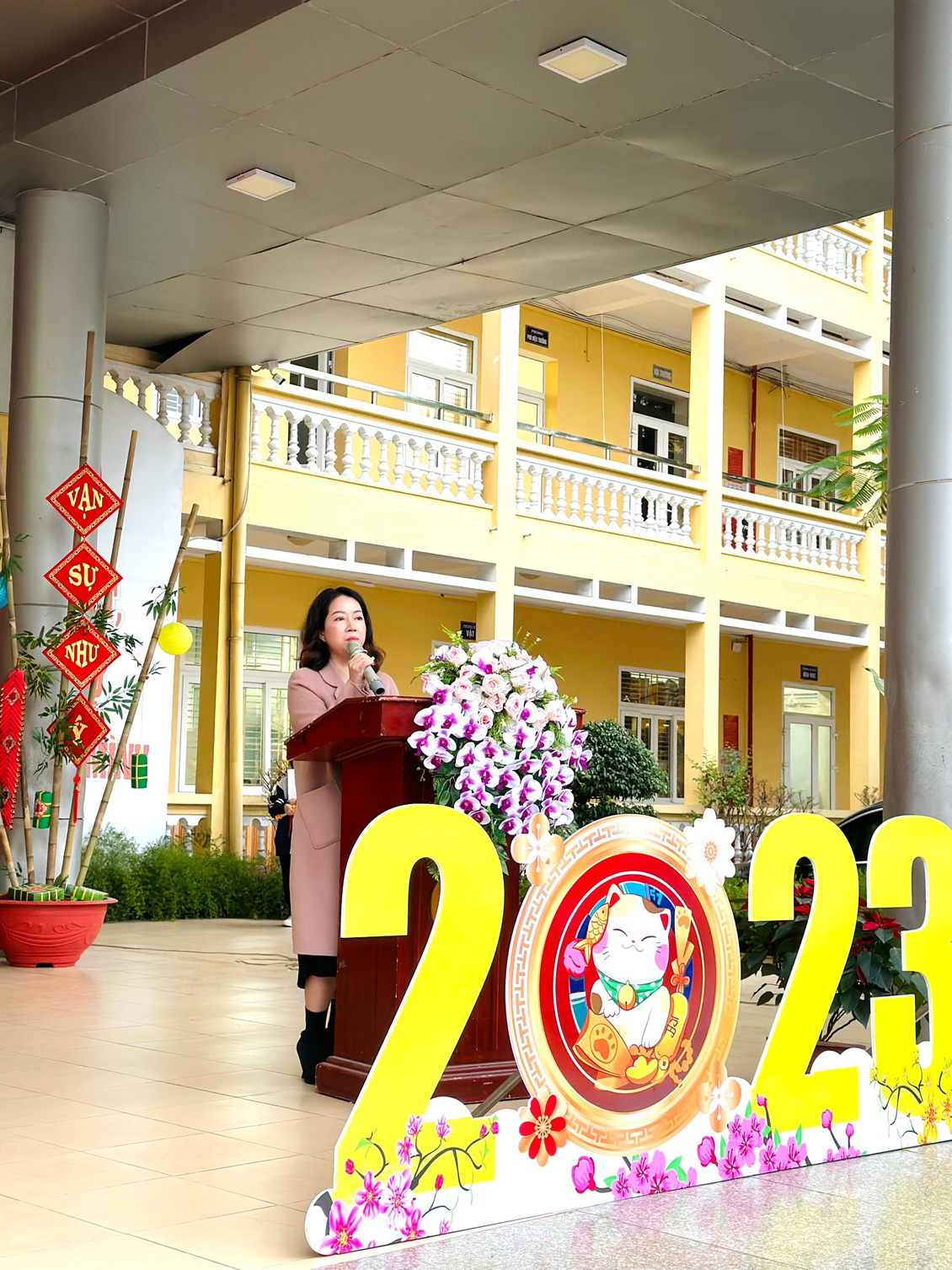 Cô giáo Trịnh Thu Hương – Hiệu trưởng nhà trường phát biểu