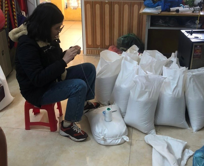 Chi đoàn Giáo viên – khâu bao, đóng gói gạo cẩn thận, tỉ mỉ