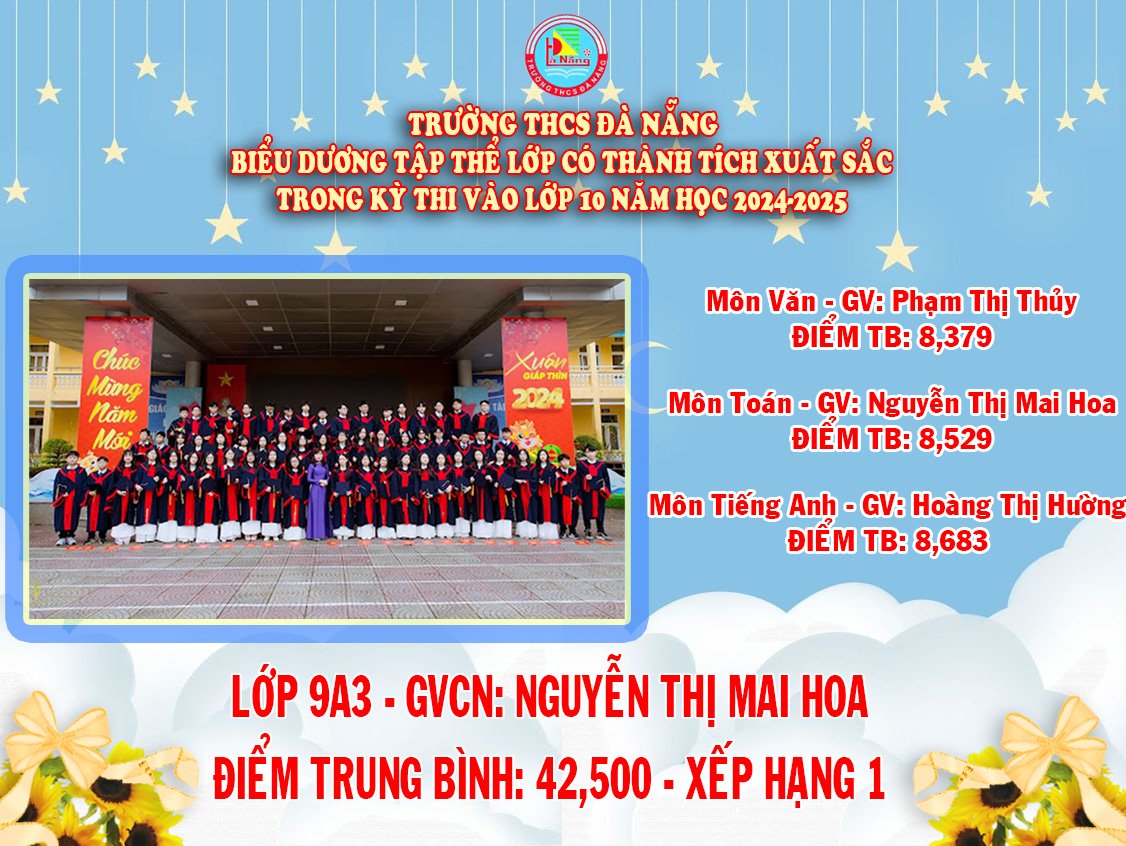 1. Lớp 9A3 do cô Nguyễn Thị Mai Hoa chủ nhiệm và dạy môn Toán, cô Phạm Thị Thủy dạy môn Ngữ văn, cô Hoàng Thị Hường dạy môn Tiếng Anh với trung bình tổng điểm xét tuyển là 42,5 điểm.