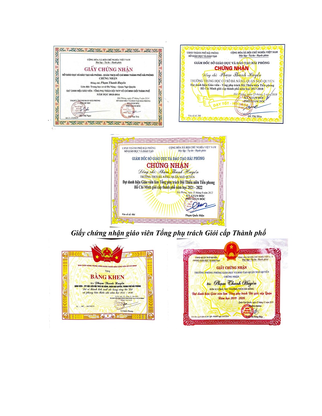 + 02 Giấy khen của Chủ tịch UBND Quận Ngô Quyền vì đã có thành tích xuất sắc trong công tác bồi dưỡng học sinh giỏi.