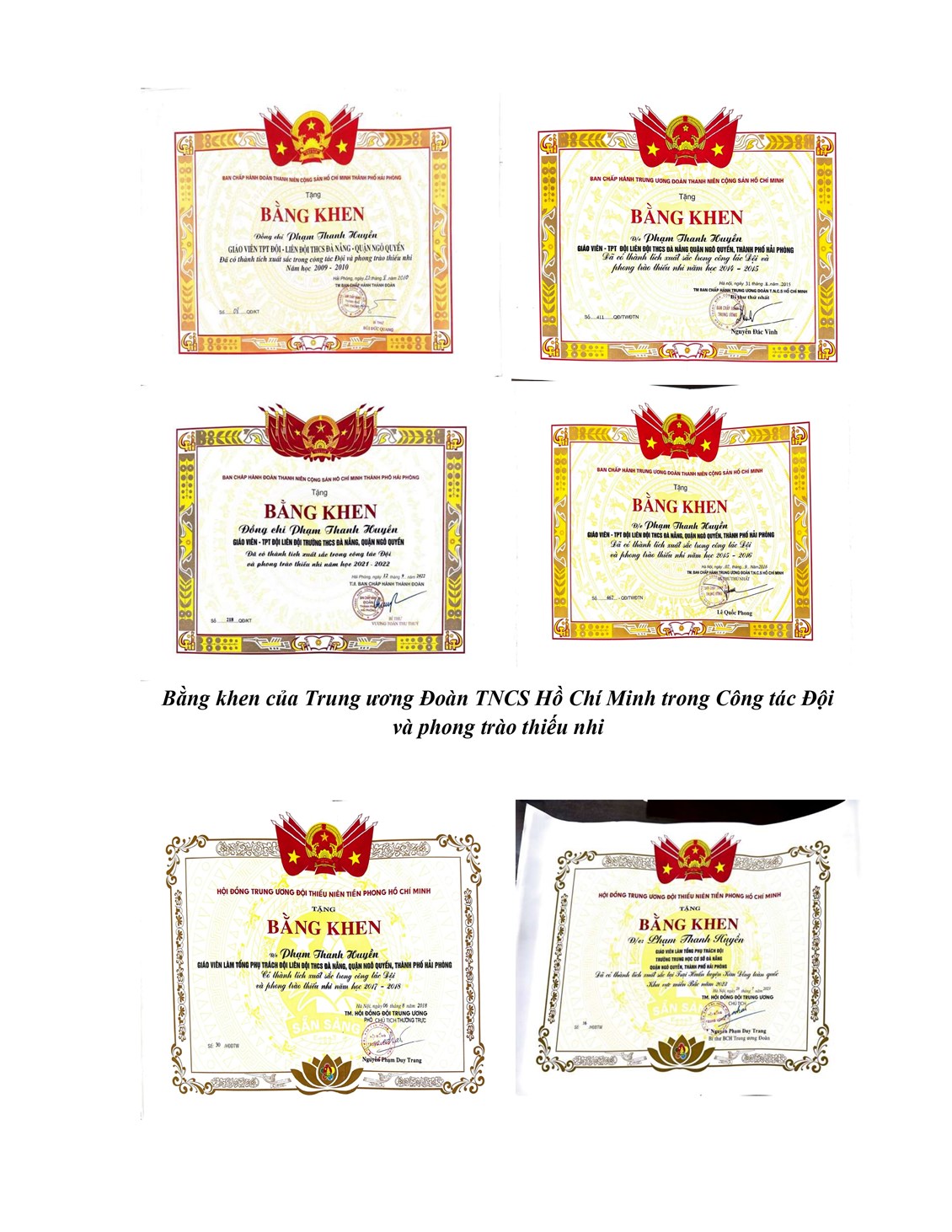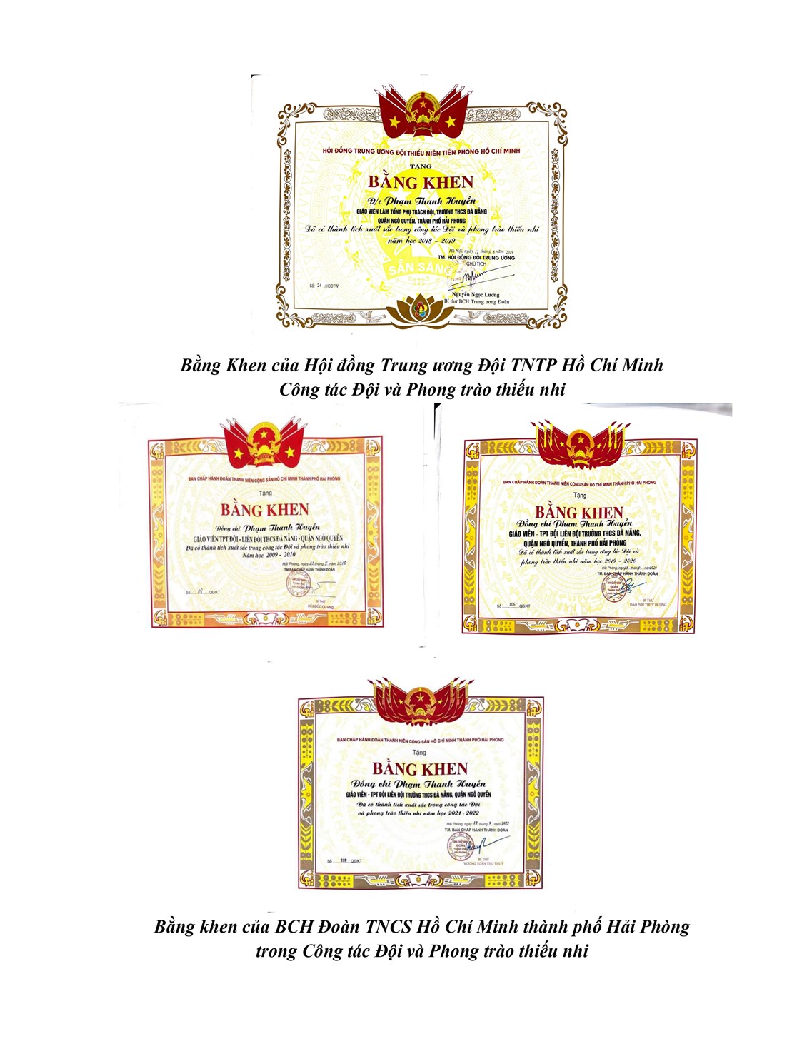 + 03 Bằng khen của BCH Đoàn TNCS Hồ Chí Minh thành phố Hải Phòng trong Công tác Đội và Phong trào thiếu nhi