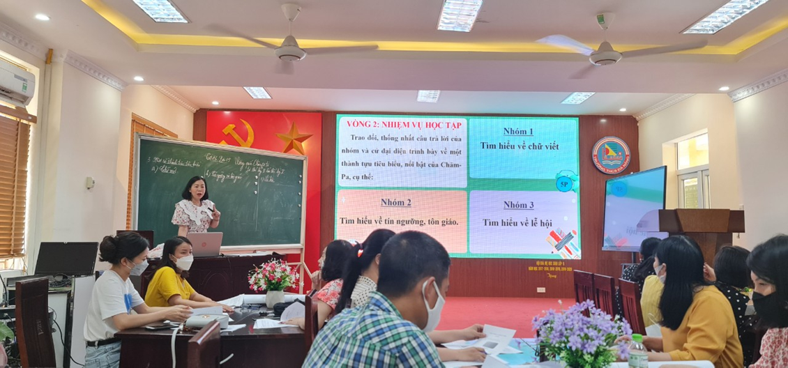 Từ những tiết dạy minh hoạ, tổ KHXH dành 1 tuần để các thầy cô xây dựng bài giảng và lên lớp chuyên đề với các bài dạy khó ở cả 4 khối 6,7,8,9. Cả 9 tiết dạy thể nghiệm đều được đầu tư công phu, tỉ mỉ từ những sản phẩm sơ đồ tư duy, phiếu học tập, tranh ảnh, video cùng cách tổ chức hoạt động dạy và học phong phú được các thầy cô trong tổ đánh giá cao đặc biệt như tiết dạy của cô Phạm Thu Trang môn Giáo dục địa phương 6, cô Hoàng Thị Minh môn Lịch sử & Địa lí 6. Những tiết dạy này đã giúp thầy cô được tiếp cận và học hỏi với những phương pháp, kĩ thuật dạy học tích cực, hiệu quả.