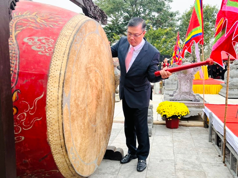 Ông Đỗ Đức Hoà, Bí thư huyện Uỷ Kiến Thuỵ đánh trống Khai hội.