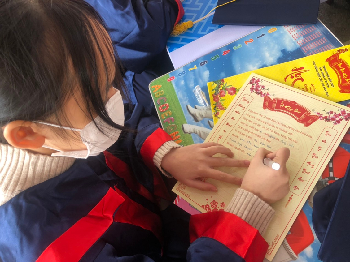 Các em học sinh chăm chú ghi những điều ước vào thư tấu các vị Vua nhà Mạc