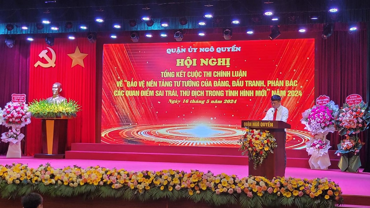 Sáng hôm nay, ngày 16-5, Quận ủy Ngô Quyền tổ chức hội nghị đánh giá kết quả thực hiện Kết luận số 01 ngày 18-5-2021 của Bộ Chính trị về tiếp tục thực hiện Chỉ thị 05 -CT/TW "Về đẩy mạnh học tập và làm theo tư tưởng, đạo đức, phong cách Hồ Chí Minh" năm 2023-2024; triển khai Chuyên đề Học tập và làm theo tư tưởng, đạo đức, phong cách Hồ Chí Minh năm 2024; tổng kết Cuộc thi Chính luận về " Bảo vệ nền tảng tư tưởng, đấu tranh phản bác các quan điểm sai trái, thù địch trong tình hình mới" năm 2024 và trao tặng Huy hiệu Đảng dịp 19-5.