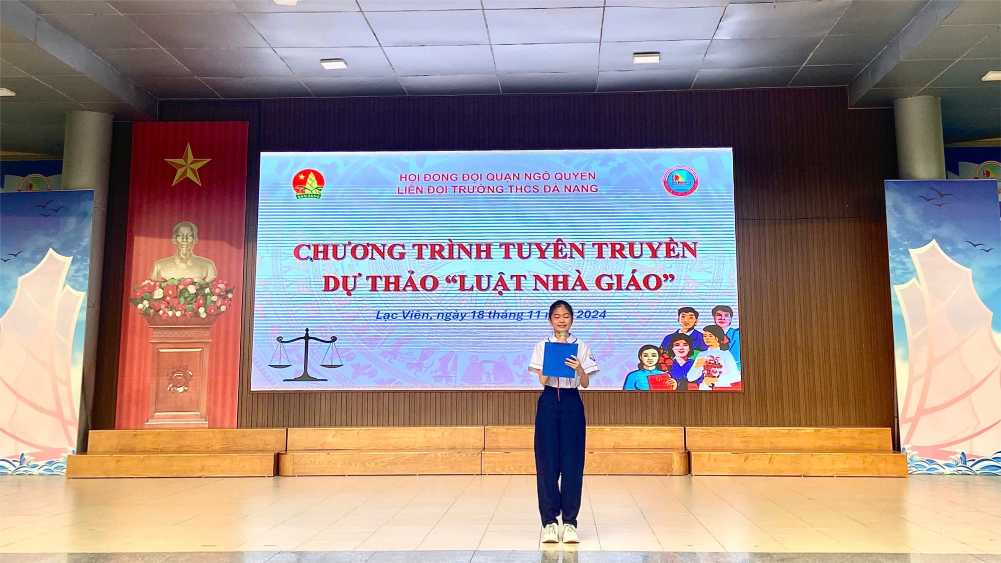 🌺Ngày 18/11/2024, Liên đội trường THCS Đà Nẵng tổ chức Chương trình tuyên truyền Dự thảo Luật nhà giáo và Tổng kết trao giải các cuộc thi Chào mừng Kỷ niệm 42 năm ngày Nhà giáo Việt Nam 20/11. Chương trình được tổ chức long trọng với sự tham gia của cô Trịnh Thu Hương – Bí thư chi bộ, Hiệu trưởng nhà trường, cô Trần Thị Cẩm Nhung – Phó bí thư chi bộ, Phó hiệu trưởng nhà trường cùng tất cả các thầy cô giáo và các bạn học sinh khối 6,7,8,9.